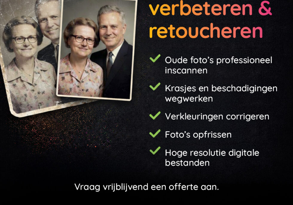 Bij Studio Shamaro zijn we gespecialiseerd in fotoverbetering en professionele retouchering. Oude, beschadigde of vervaagde foto’s herstellen we zorgvuldig en met respect voor het origineel. Geen kunstmatige filters, maar subtiele correcties waardoor de herinnering weer tot leven komt.
